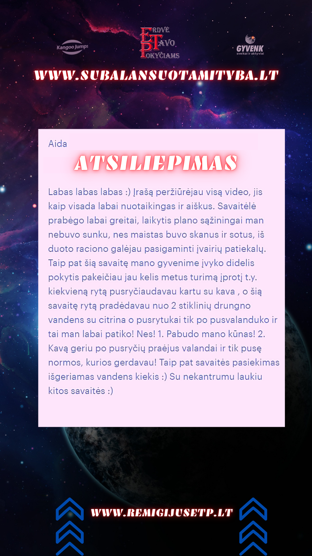 Esu labai patenkinta , jaučiuosi labai gerai, sau patinku patinka kad ir rūbai kitaip žiūrisi ir atrodo, kad atsirado noras puoštis, kad norisi ir naujos aprangos atsinaujinti UŽ tai ir dėkoju, už motyvacija pokyčiams, tikslo siekimo, maisto įvairumo, kontrolę kuri padeda nenuklysti!